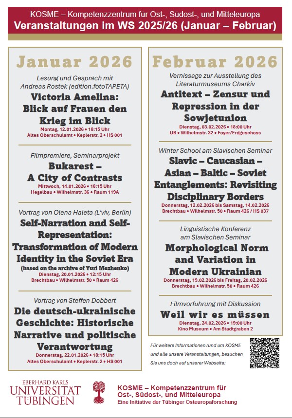 Zu Beginn des Wintersemester 2025 ist an der Universität Tübingen das Kompetenzzentrum Ost-, Südost- und Mitteleuropa (KOSME) gegründet worden. Es führt die in den unterschiedlichen universitären Abteilungen sowie die im Institut für donauschwäbische Geschichte und Landeskunde vorhandene Raum-, Sprach- und Sachkompetenz zusammen. Durch diese koordinierte Bündelung der Raumexpertisen hoffen wir auf mehr Synergien in Forschung und Lehre. Zugleich wird KOSME öffentliche Veranstaltungen organisieren, um Hintergrundwissen sowie Gegenwartsanalysen zu vermitteln und damit in der Tübinger Wissenschaftskommunikation Akzente zu setzen.